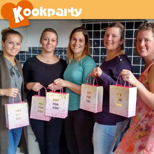 Als groep vriendinnen van een carnavalsvereniging hadden ze met elkaar afgesproken, om naast de carnavalsfeestjes ook eens iets anders met elkaar te ondernemen. De keuze was gevallen op een bonbons party. Zo gezellig om op een zondagmiddag met elkaar rond de tafel met chocola en allerlei lekkere vullingen bezig te zijn en dat je dan ook nog eens een mooi en lekker resultaat krijgt verpakt in een super leuke tas. Het was een geslaagde Kookparty! Ook een activiteit met vriendinnen plannen, vraag dan vrijblijvend meer informatie aan over één van de leuke Kookparty thema's.