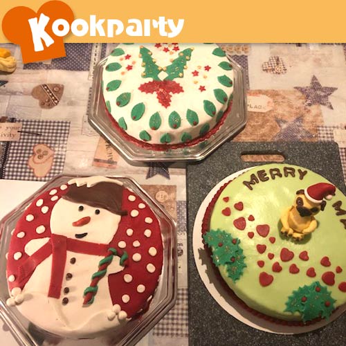 Vervolgens gingen we aan de slag om de taarten mooi te decoreren. Iedereen had voor zichzelf bedacht wat ongeveer het eindresultaat moest worden. Met glitterpoeder en sterretjes werden de taarten extra versierd. De taarten werden aan de onderkant netjes afgewerkt met een randje van marsepein. Na 2,5 uur bakken & knutselen hadden de dames ieder een prachtige taart gemaakt in kerstsfeer!!