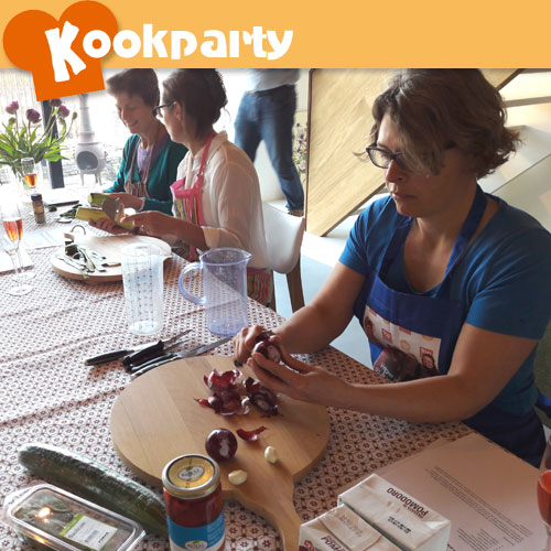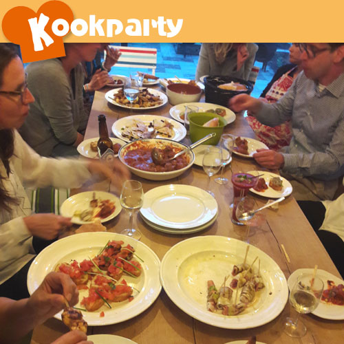 De tapasparty was ter ere van de 45e verjaardag van Ellis. En het was een mooie gelegenheid om haar nieuwe keuken te leren kennen. Samen met 8 vriendinnen heeft ze tapas leren maken: albondigas, verschillende bruschetta's, courgetterolletjes met parmaham, empanadas, gazpacho, mozarella kroketjes, pinchos de pollo, quesadillas en verduras fritas. Na het kokerellen hebben de dames en partners heerlijk kunnen genieten van de tapas. Ze hebben er een gezellige avond van gemaakt.
