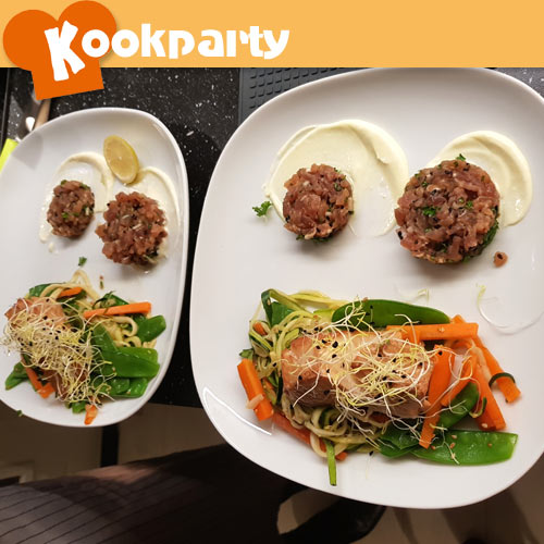 Met groene thee gerookte zalm op een bedje van cougetti, julliène geneden wortel en peultjes met een dressing van mirin, sesamolie en soyasaus. Tartaar van tonijn met een wasbi mayonaise.